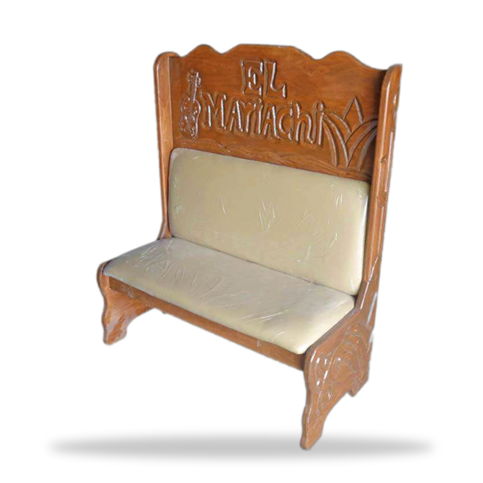 Este booth rustico el Mariachi artesanal en madera maciza. Resistente, auténtico y perfecto para restaurantes y bares con estilo mexicano.