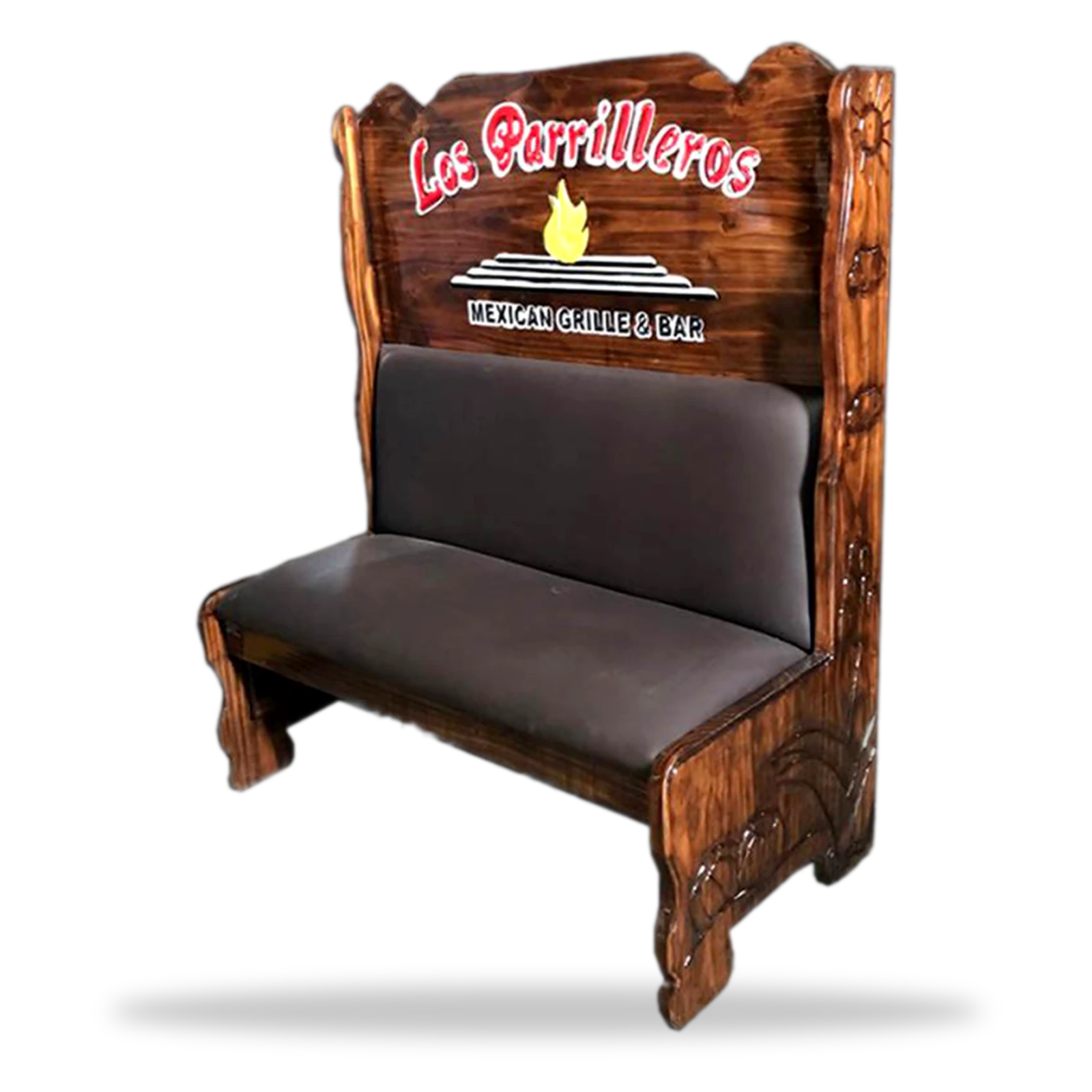 Este booth rustico los Parrilleros artesanal en madera maciza. Resistente, auténtico y perfecto para restaurantes y bares con estilo mexicano.
