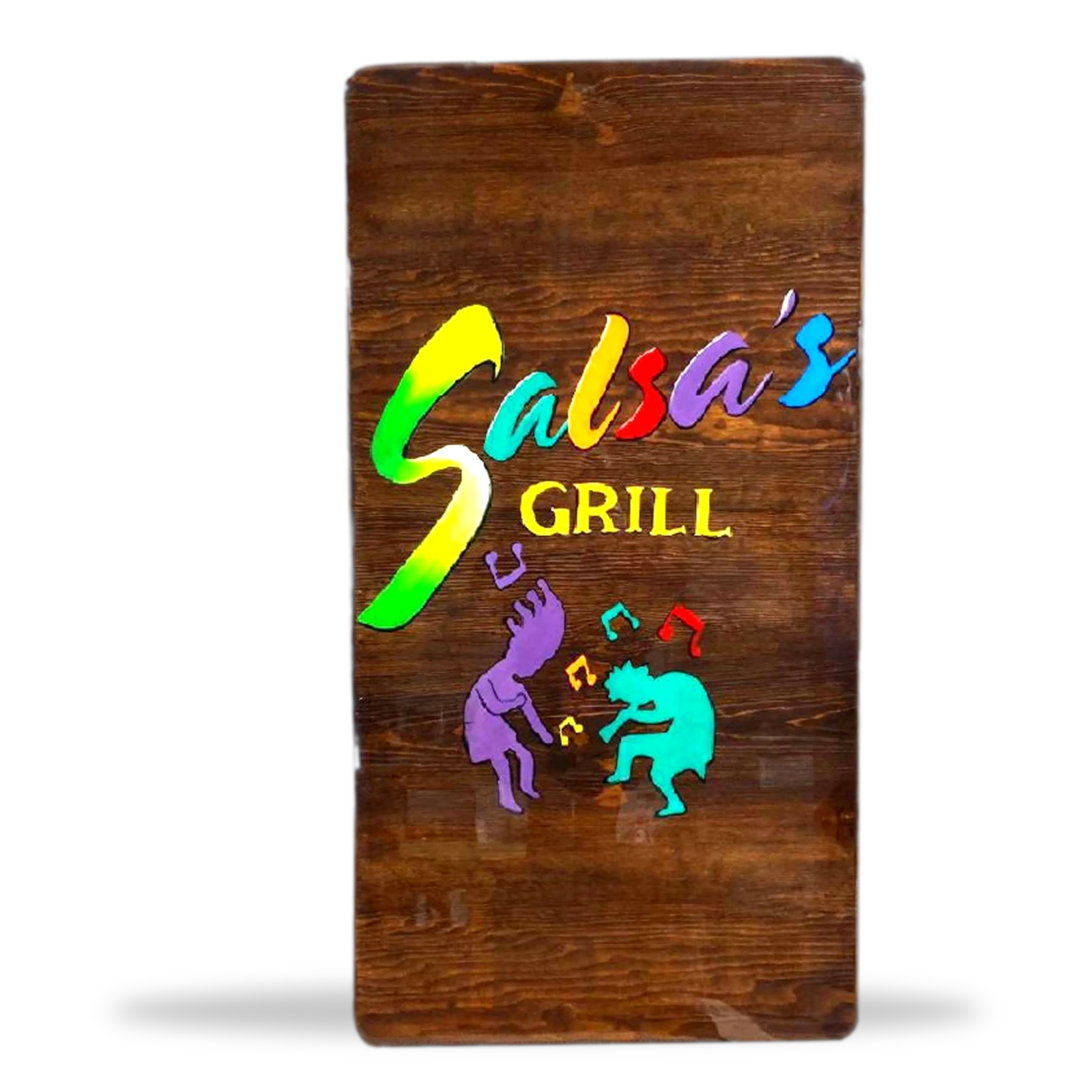 Este mesa rustica tapa Salsas artesanal en madera maciza. Resistente, auténtico y perfecto para restaurantes y bares con estilo mexicano.
