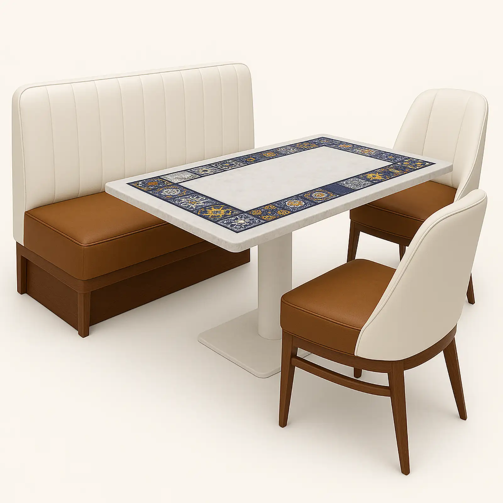 Este modelo está disponible en distintos tonos de madera (claro, nogal, caoba, oscuro) y en varios colores de tapizado. También podemos personalizar medidas y acabados para que se adapten perfectamente al estilo y decoración de tu restaurante.