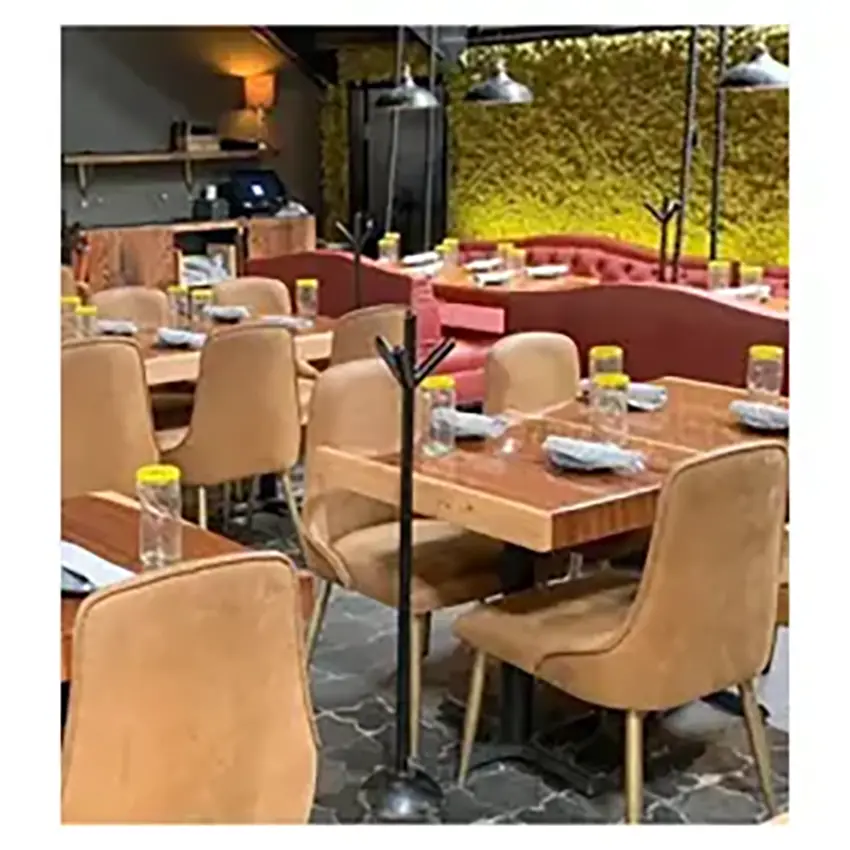 Este modelo está disponible en distintos tonos de madera (claro, nogal, caoba, oscuro) y en varios colores de tapizado. También podemos personalizar medidas y acabados para que se adapten perfectamente al estilo y decoración de tu restaurante.