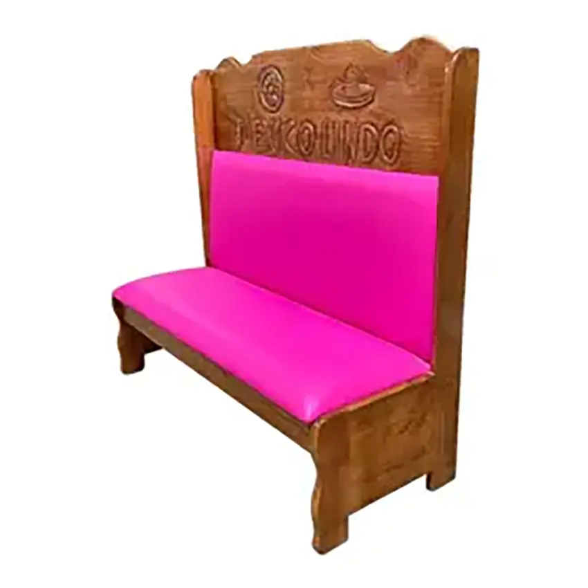 Este modelo está disponible en distintos tonos de madera (claro, nogal, caoba, oscuro) y en varios colores de tapizado. También podemos personalizar medidas y acabados para que se adapten perfectamente al estilo y decoración de tu restaurante.