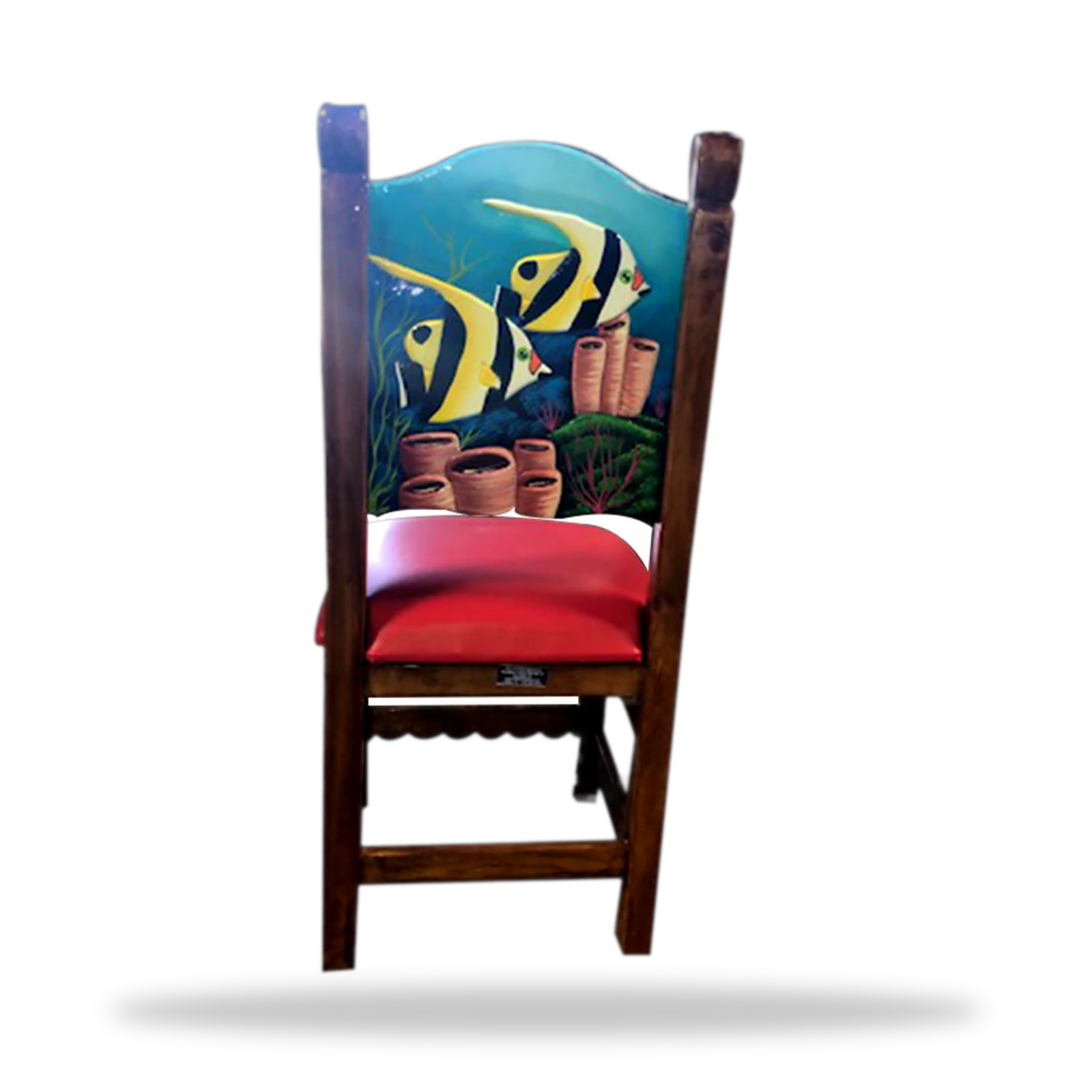 Este silla artistica tallado Artistico 046 artesanal en madera maciza. Resistente, auténtico y perfecto para restaurantes y bares con estilo mexicano.