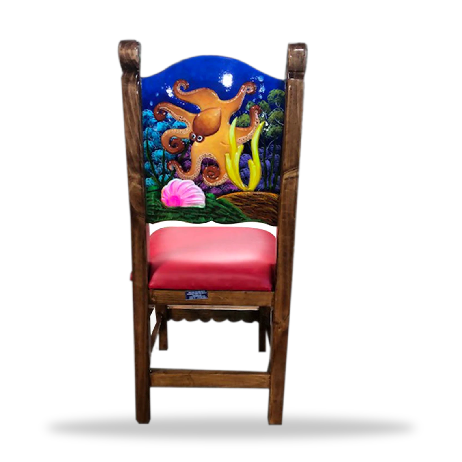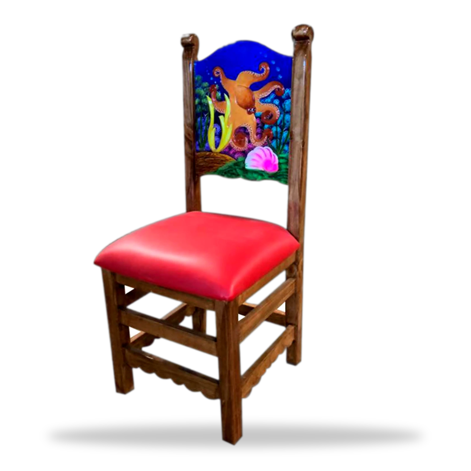 Este silla artistica tallado Artistico 047 artesanal en madera maciza. Resistente, auténtico y perfecto para restaurantes y bares con estilo mexicano.