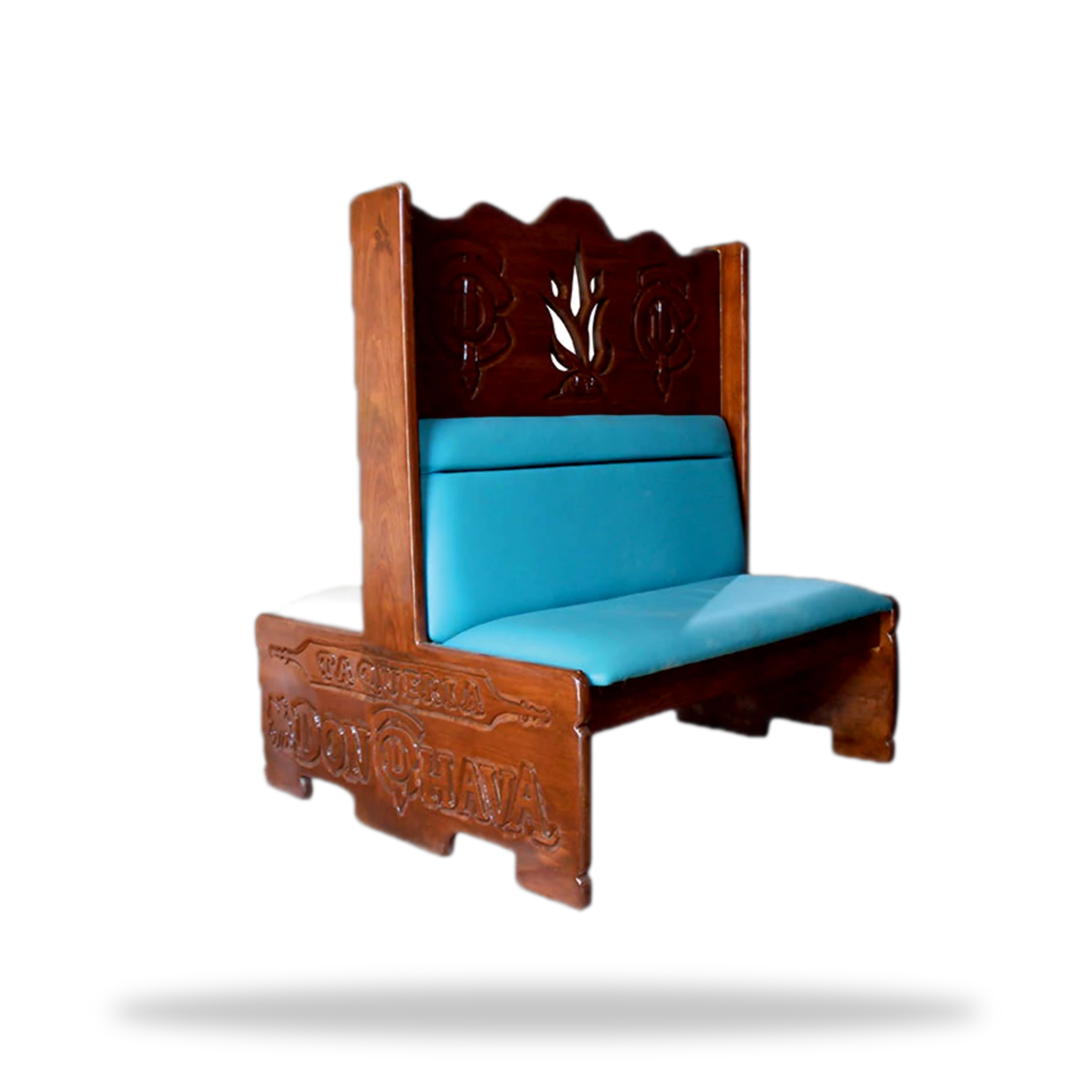 Este booth moderno grabado Real artesanal en madera maciza. Resistente, auténtico y perfecto para restaurantes y bares con estilo mexicano.
