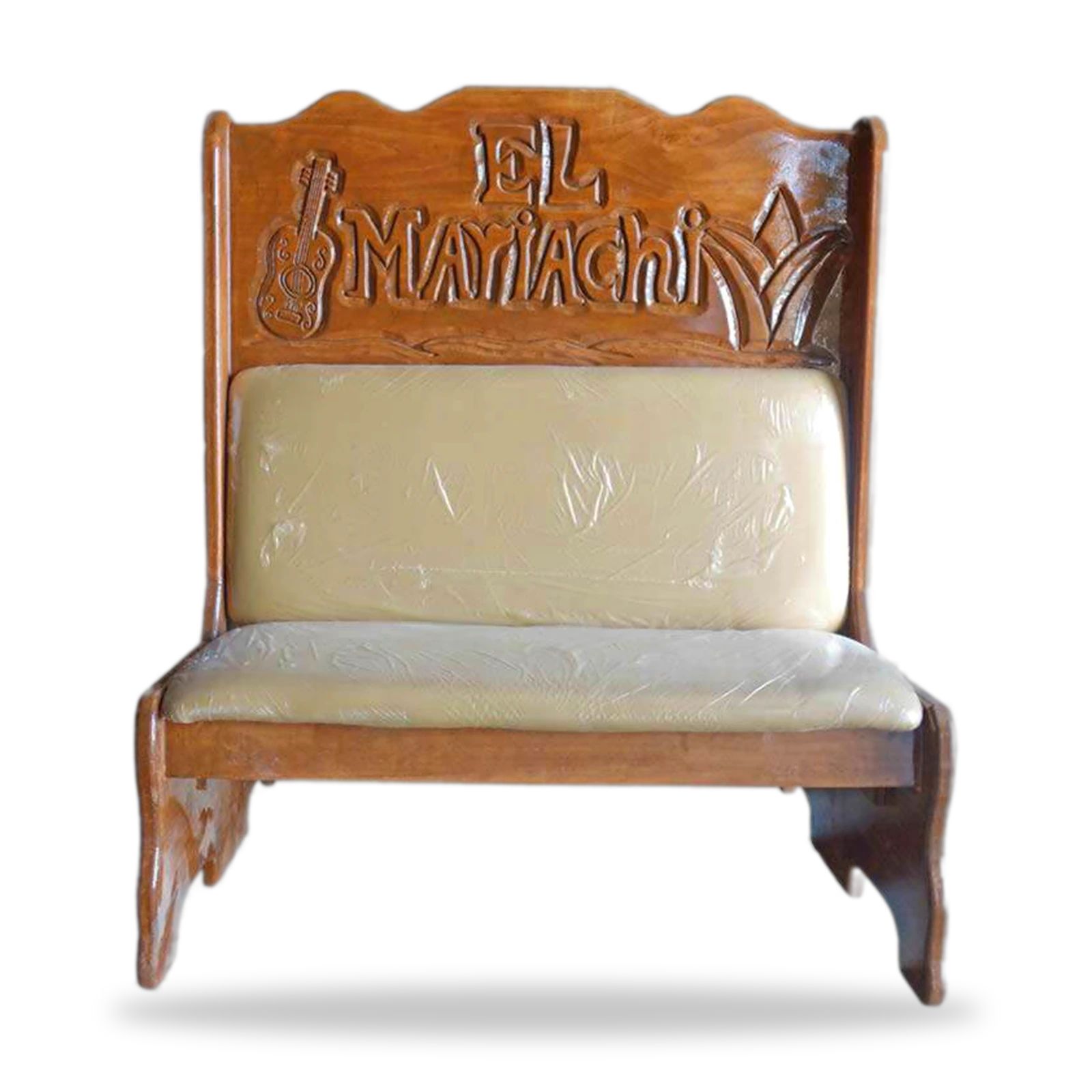 Este booth rustico el Mariachi artesanal en madera maciza. Resistente, auténtico y perfecto para restaurantes y bares con estilo mexicano.